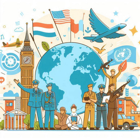 World Peace Day concept. Group of soldiers with guns. Vector illustration