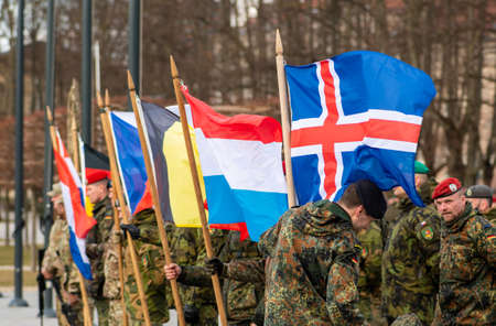 Vilnius, Lithuania - March 29 2022: Flags of various European countries members of NATO force integration unit, close up