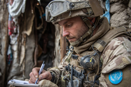 In an operational military outpost, a soldier is focused on writing notes in a notebook. He wears tactical gear and checks his surroundings as he documents important information.