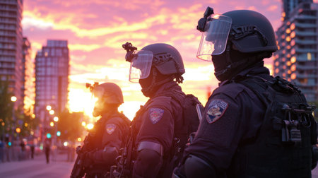 Three police officers stand on a street corner, one of them wearing a helmet. The sun is setting in the background, casting a warm glow over the scene. The officers appear to be on duty
