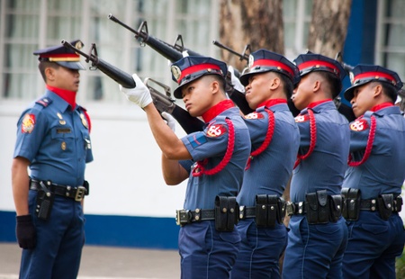 Military officers in formation with rifles during a ceremony. Honoring military service and discipline.