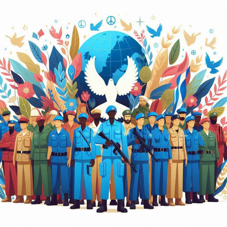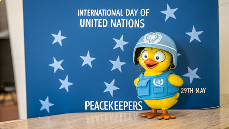 A cheerful yellow chick mascot dressed as a UN Peacekeeper celebrates the International Day of United Nations Peacekeepers, honoring their global service and dedication.
