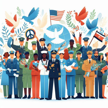International Day of Peace. Group of soldiers on the background of the flag of the United States.