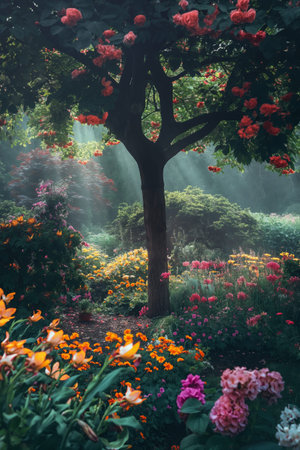 Serene Garden with Sunlit Flowers and Lush Tree Canopy in Morning Glow.