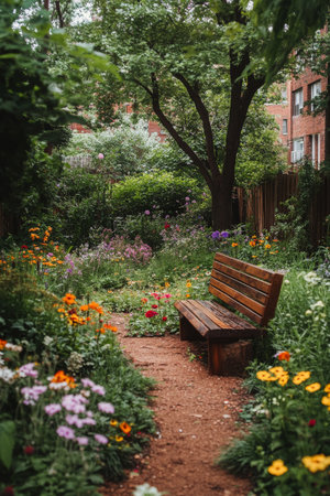 A beautiful urban garden pathway featuring winding paths surrounded by lush greenery and vibrant flowers, creating a serene escape in springtime.