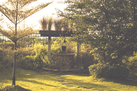 Calm and serene garden with ample copyspace, colorful skies and vegetation. Property outdoors conceptual image for reflection and relaxation.