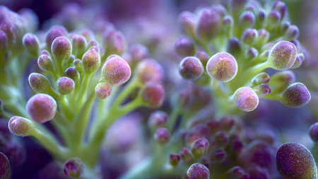 Close-up of purple sprouting broccoli showing the tiny florets and green stalks in soft focus.