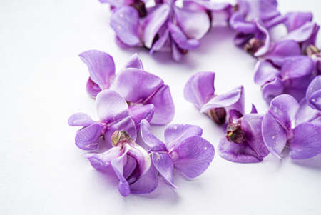 Beautiful vivid lilac flowers on light background. Flat lay spring time concept.
