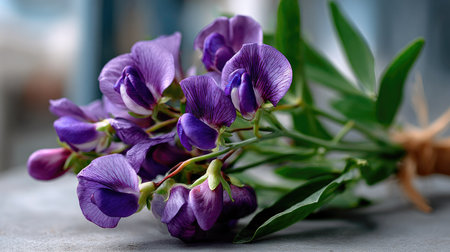 A stunning arrangement of purple flowers tied with fresh green leaves rests on a gray surface, showcasing the beauty of nature in a serene composition.