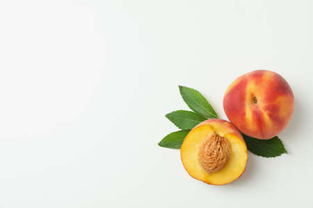 Ripe juicy peaches and green leaves on a light background with place for text.