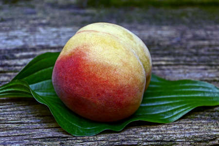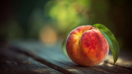 A single, ripe peach, displaying vibrant red and yellow hues, rests upon a weathered wooden surface, accompanied by a fresh green leaf. The scene features soft, natural lighting and a blurred background.