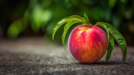 This image features a single peach with leaves against a blurred green garden background, creating a vibrant, organic scene. The peach rests on a textured stone surface.