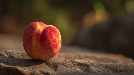 A single ripe peach sits on a weathered stone surface, bathed in golden sunlight. The peach displays vibrant red and yellow hues, contrasting with the stone's earthy tones.