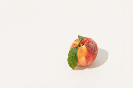 Minimal summer fruit pattern made of sunlit orange-yellow fresh, ripe peach with green leaf on isolated pastel beige background. Plant texture. Sun and shadows. Organic, healthy, raw food concept.