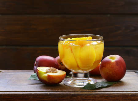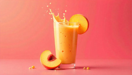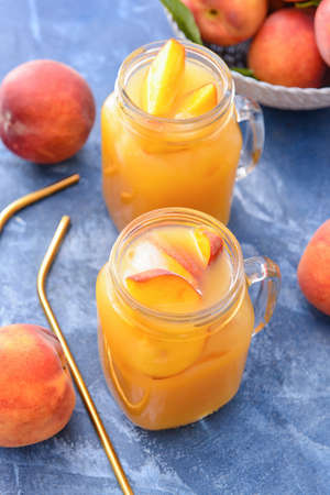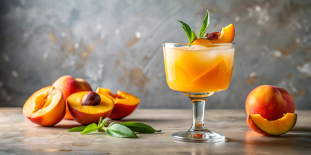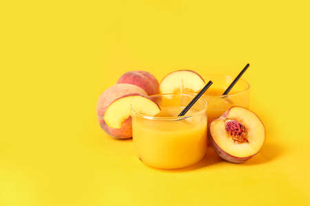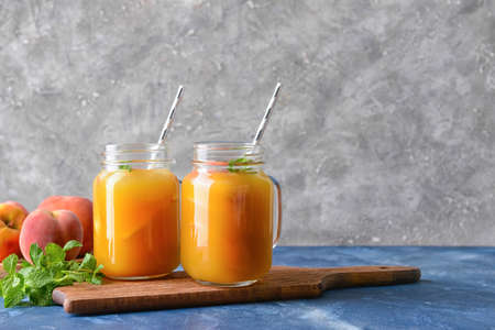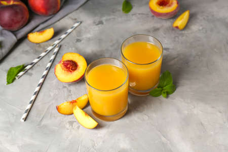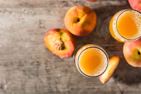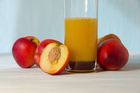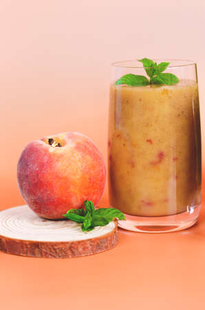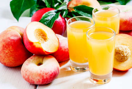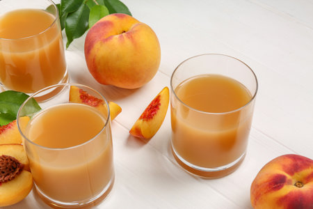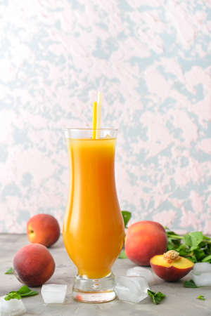 Fresh peach juice with fruits on a white wooden background, selective focus
