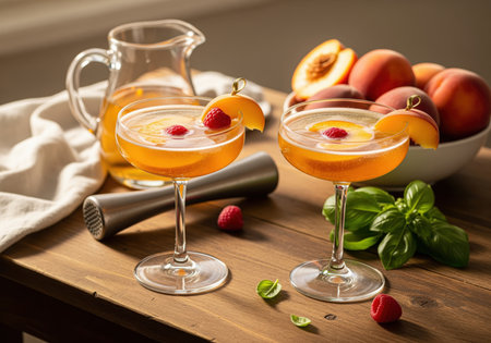 Bright fruit summer beverage with ripe peach, ice, green rosemary twig, sugar rim, fruit pieces in modern soft light white bar interior.