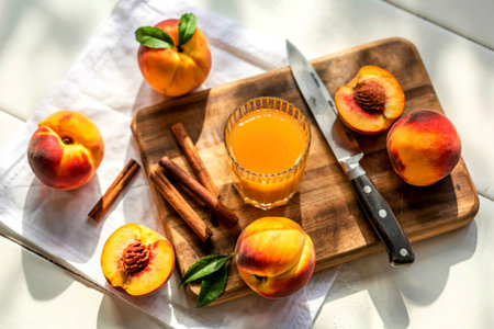 top view of delicious yellow peaches on a wooden kitchen board with cinnamon sticks with knife