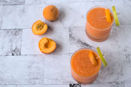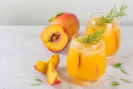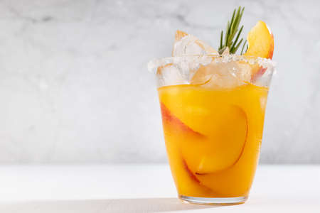 Healthy summer juice - peach cocktail with ice, rosemary twig, sugar rim, fruit slices in misted glass in elegant white interior on white marble countertop. Closeup.