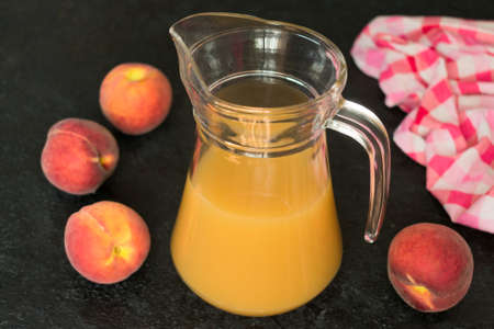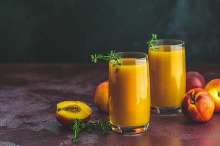 Glass of fresh healthy peach smoothie or juice on dark concrete surface table. Shallow depth of the field, close up, copy space for you text