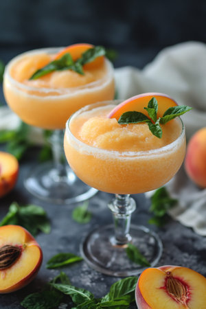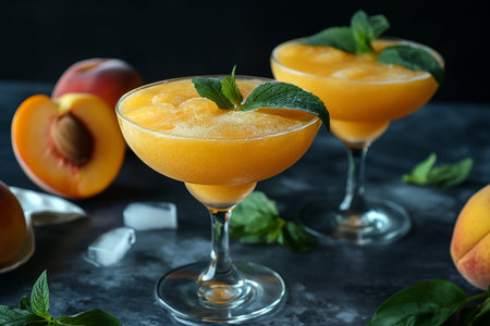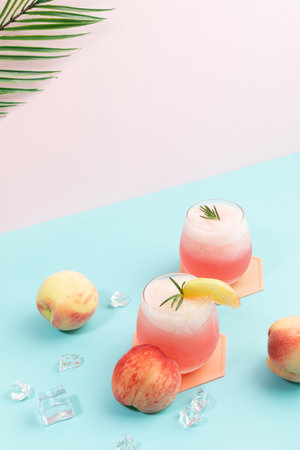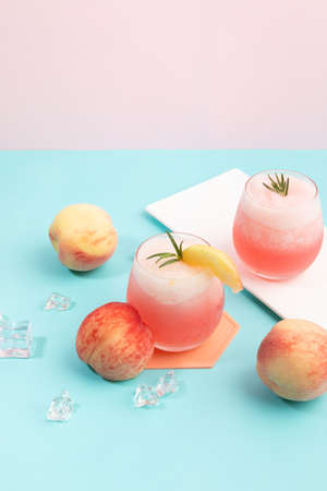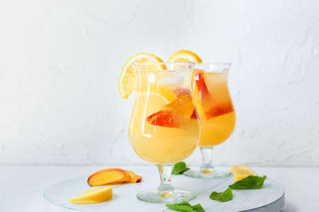 Flat peach martini or margarita lemonade cold fruit drink, summer iced fruit juice cocktail with mint and lemon, on white table