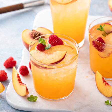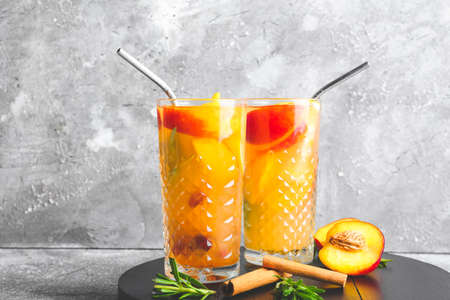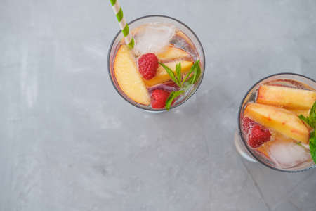 Homemade iced lemonade or tea with ripe peaches and Raspberries. Grey background. Top view, space for text