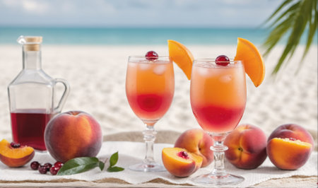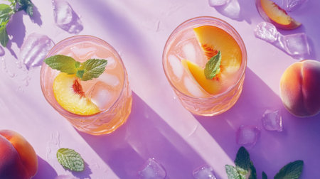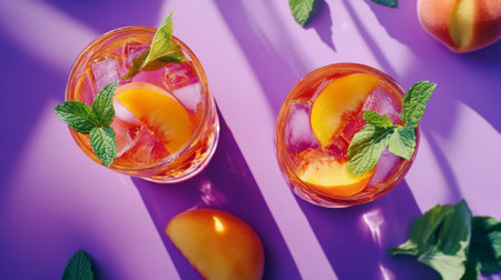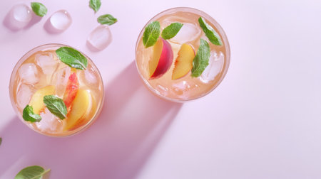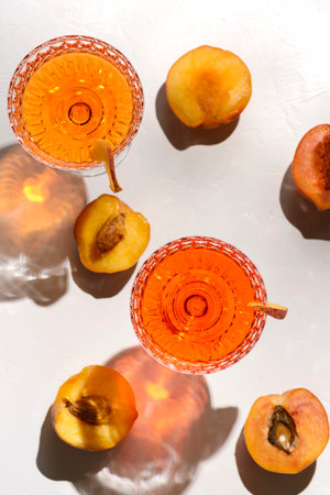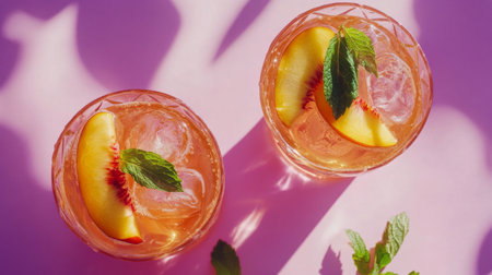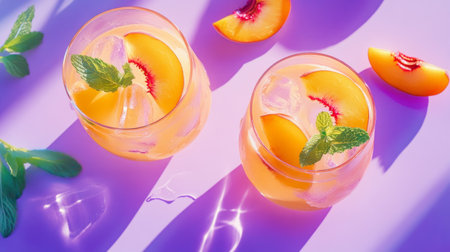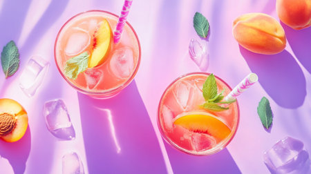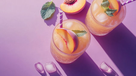 Two glasses with fresh iced peach juice drink and fruits on table with sunlight shadow of palm leaves, healthy organic summer detox nourishment, top view.
