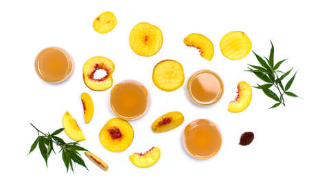 Peach juice bottle. Nearby are juicy, beautiful peaches. Studio photo on a white background.