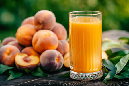 Healthy breakfast - ripe peaches, croissants and glass of freshly squeezed juice on table. Vegetarian food, vitamins, summer harvest from fruit tree.