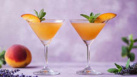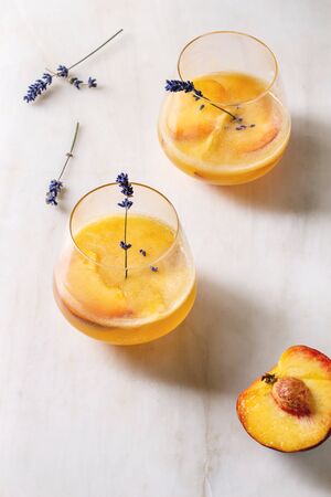 Peach cold lemonade or Bellini cocktail with lavender flowers served in two glasses on white marble table. Homemade summer drink.