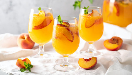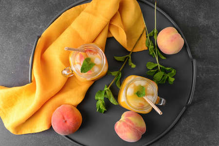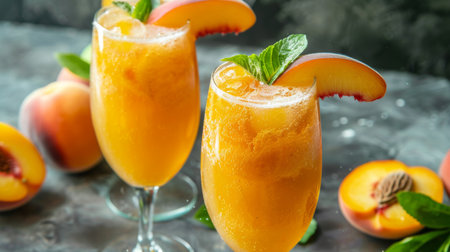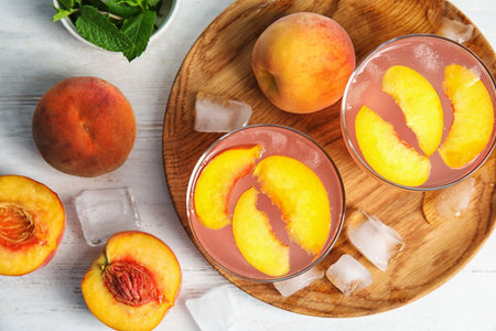 Tasty peach cocktail in glasses on table, top view. Refreshing drinks