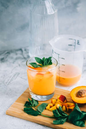 Ice lemonade in glass with peach pieces, fresh mint and ice cubes on the table