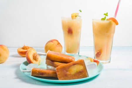 peach ice cream on a stick in a blue plate and ice cubes, peach refreshing juice in a glass with ice and pieces of fruit and mint in the summer. top view on a light background