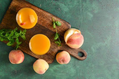 Glasses of peach juice, fresh fruits and leaves on white wooden table