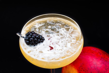 Food and drink, holidays party concept. Cold fresh alcohol beverage american fizz cocktail in a flute glass with rum, champage, juice and banana on a wooden table