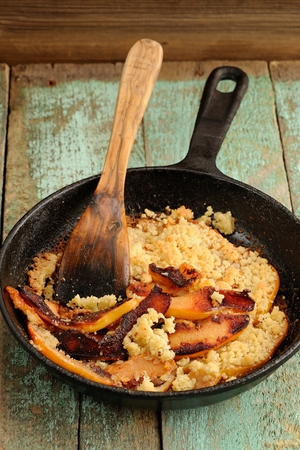 Plum cobbler in the fraing pan . style vintage.. selective focus
