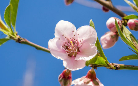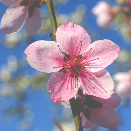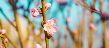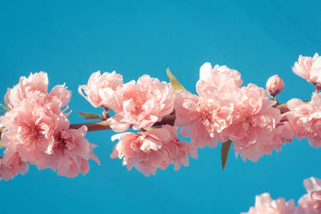 blooming pink peach flowers branch in spring in the garden against the blue sky pollinating fruits of beauty