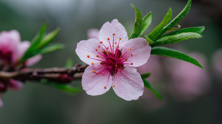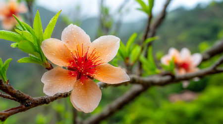 Delicate peach blossom flower with water droplets and lush green foliage.