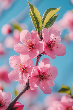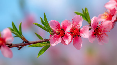 Vibrant Peach Blossom Branch Against Soft Blue Sky in Spring