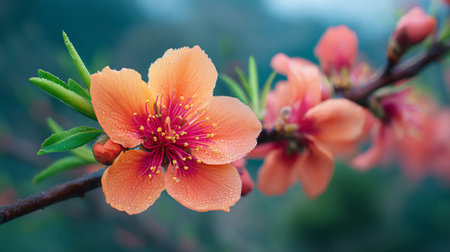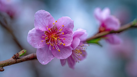 Delicate Pink Peach Blossoms with Dewdrops on a Branch