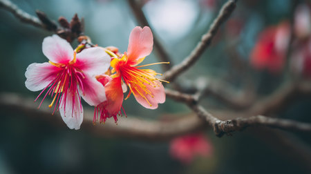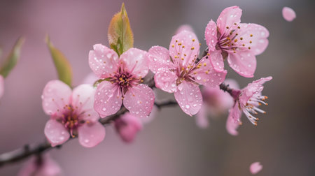 Cherry blossom flowers exhibit their vibrant pink colors in spring as raindrops adorn their delicate petals. The background blurs, enhancing the beauty of the blossoms.
