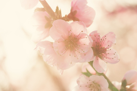 Soft peach blossoms illuminated by warm sunlight, with delicate petals and visible stamens against a blurred background.