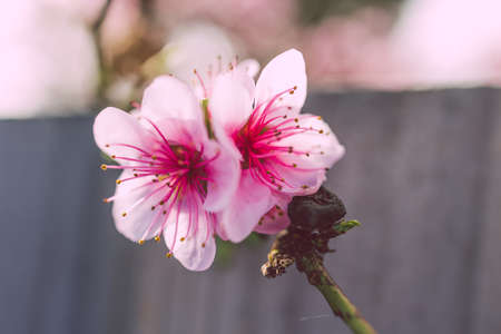 Pink flower on a peach branch close up. Detail of the flower of a peach tree in spring.