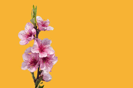 Pink peach tree flowers, blooming branch isolated on yellow background with copy space