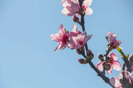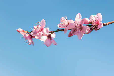 pink peach tree flowers in bloom isolated against blue sky with copy space