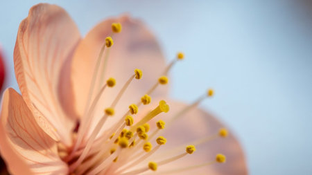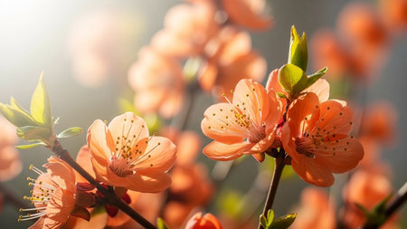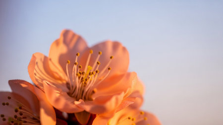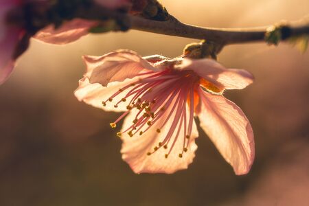 A close-up macro view of delicate pink and orange cherry blossom flowers bathed in the warm glow of golden hour...