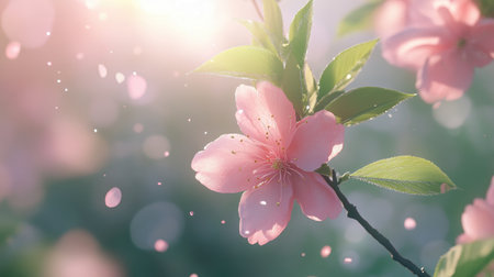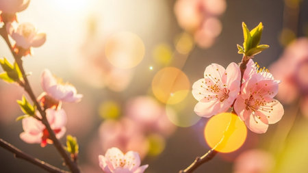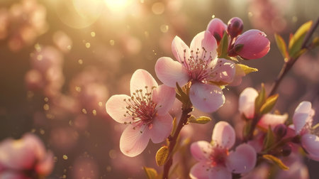 Delicate pink cherry blossom flowers are in bloom on a branch, bathed in soft golden sunlight with a blurred bokeh...