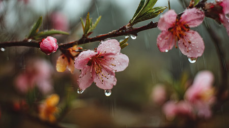 Soft rain falling gently on Peach tree, with water droplets forming and slowly dripping. The background is softly blurred with a natural, moody atmosphere.