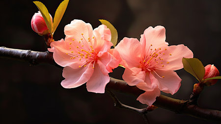 Pink peach flowers blooming on a branch, celebrating the arrival of spring and the beauty of nature. Ai generative