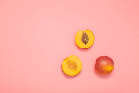 Bright juicy nectarines full of vitamins. A whole and a cut peaches on a saturated pink background. Copy space.