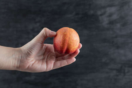 Holding a red peach and tapping on it on black background